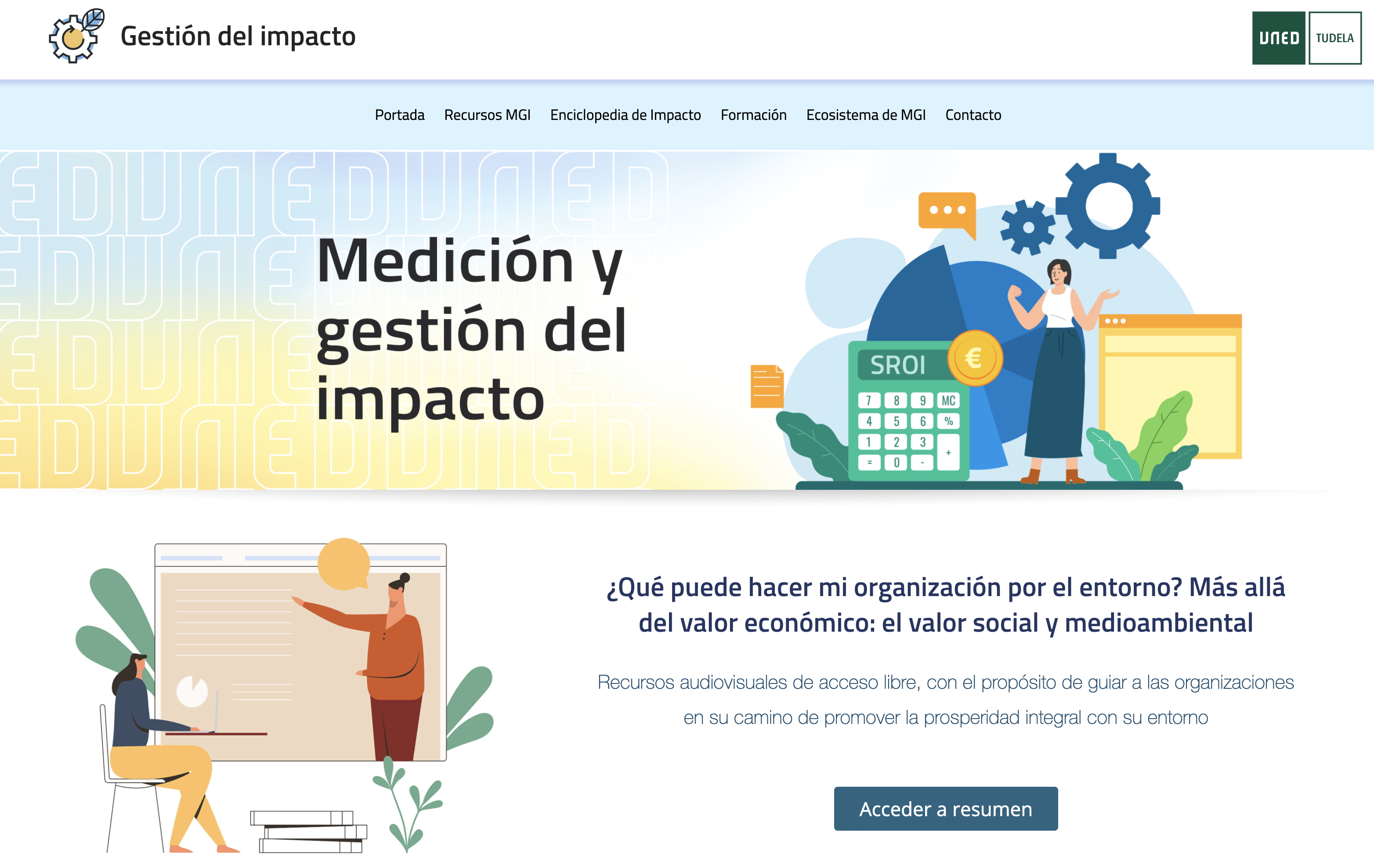La página web del proyecto sigue presentando sus cuatro grandes bloques, aunque el próximo año dispondrá de uno nuevo, en el que se volcarán los resultados del informe De la medición de impacto a la gestión por impacto, elaborado por ESImpact y que ofrece una visión actual de cómo se está trabajando el impacto social y ambiental tanto en España como, más concretamente, en Navarra. El documento será presentado por UNED Tudela durante el primer semestre del 2026, ofreciendo una imagen clara de los avances, dificultades y necesidades que existen ahora mismo en la medición y la gestión del impacto.